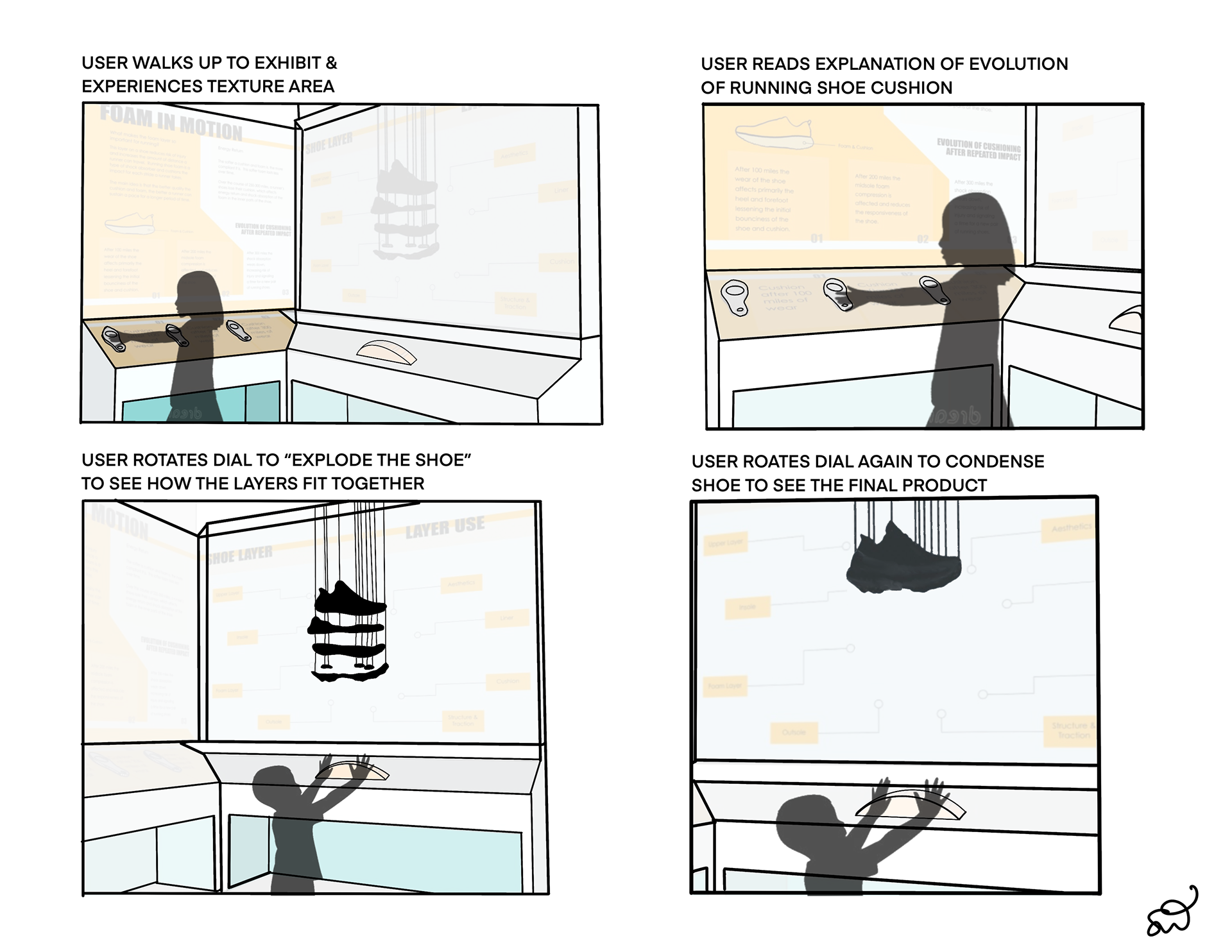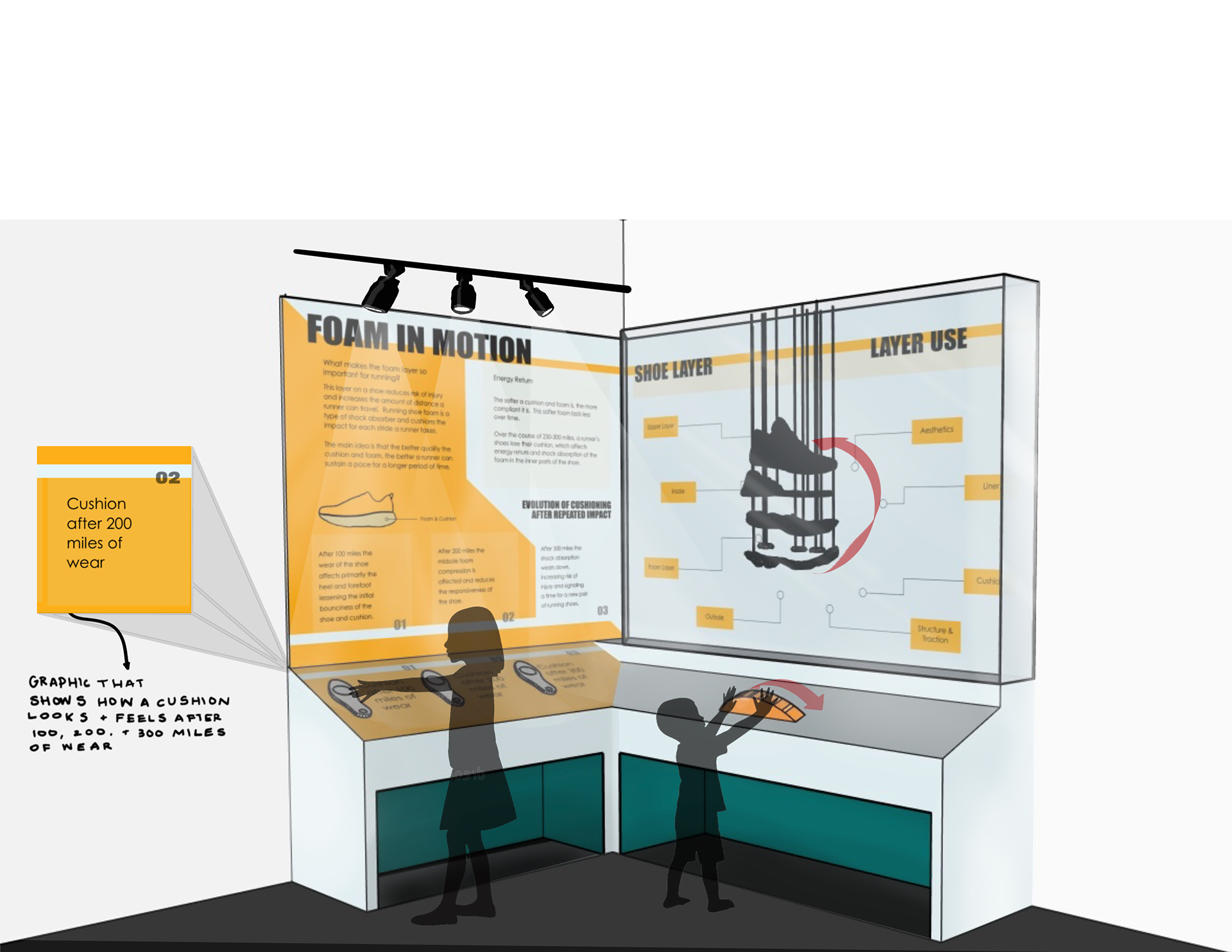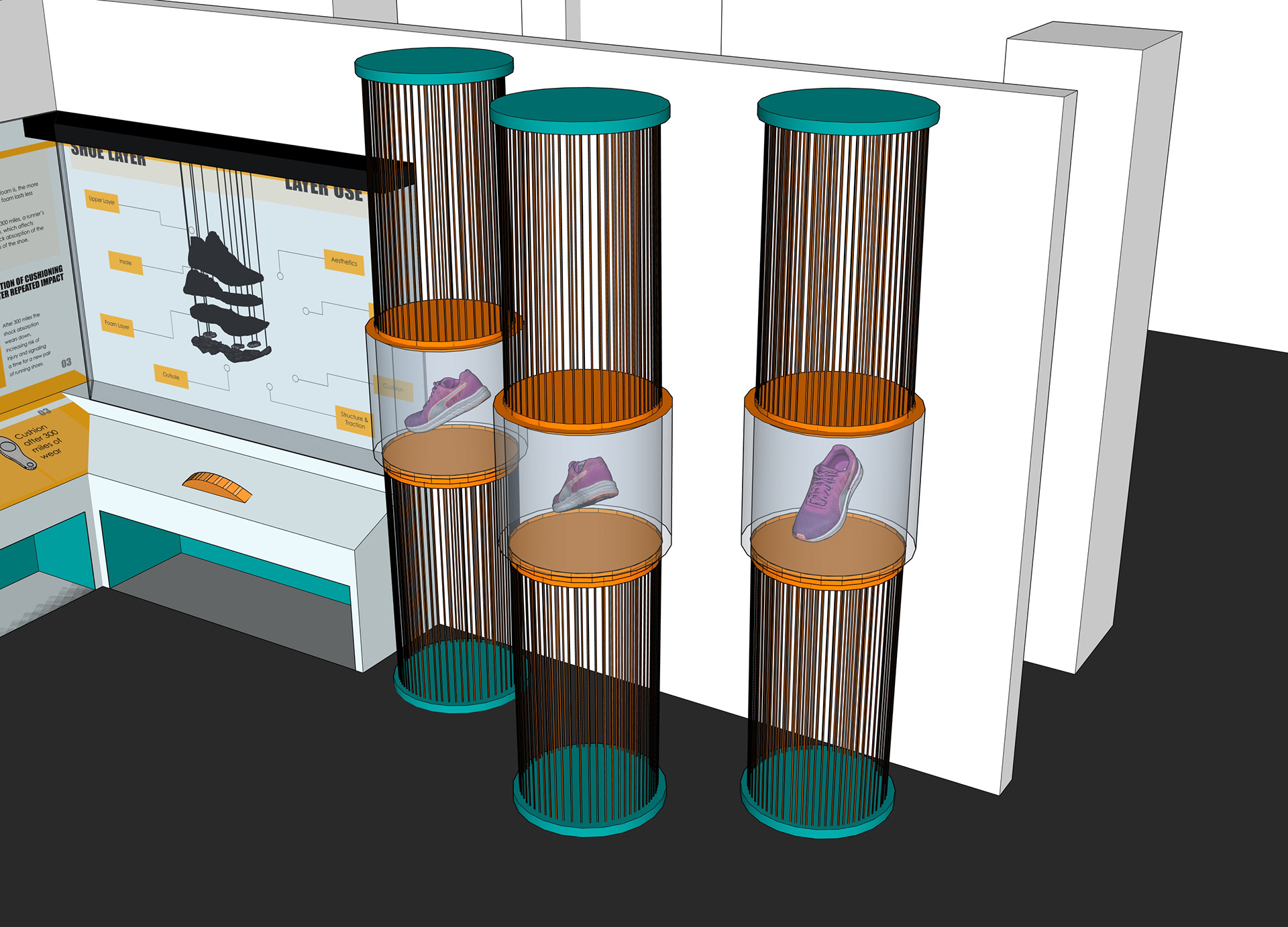 My specific design focuses on creating an inviting space to learn about the wear and tear of running shoes, specifically about long distance running shoes. The exhibit teaches primarily the evolution of the tread and cushion of a distance running shoe by using textured shoe soles that people can touch and feel as well as an "exploded view" of a generic distance shoe that expands and condenses using a dial that users can interact with.