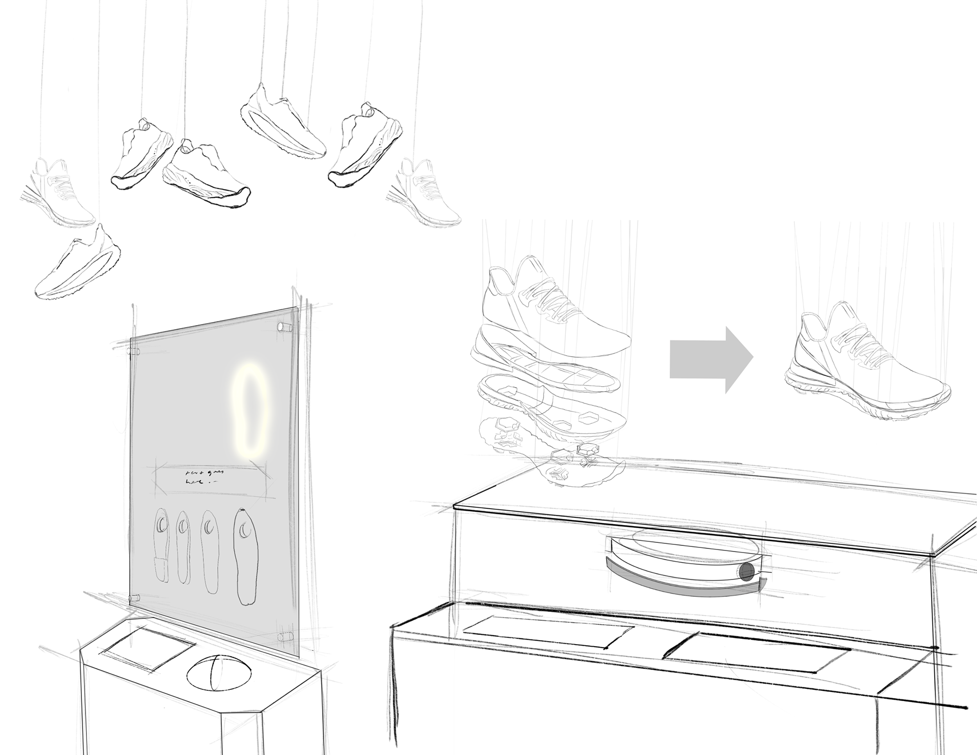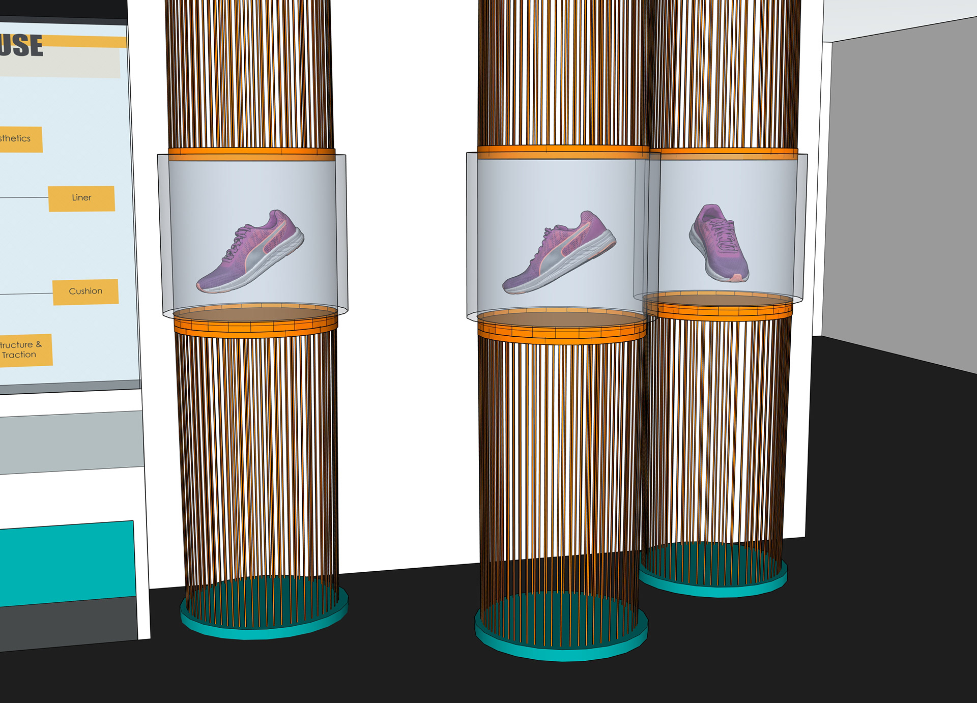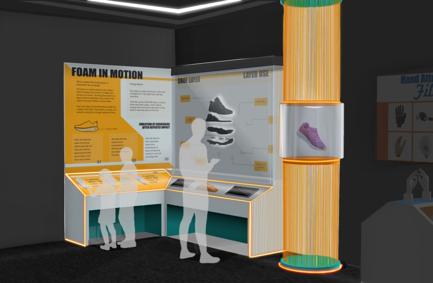 My specific design focuses on creating an inviting space to learn about the wear and tear of running shoes, specifically about long distance running shoes. The exhibit teaches primarily the evolution of the tread and cushion of a distance running shoe by using textured shoe soles that people can touch and feel as well as an "exploded view" of a generic distance shoe that expands and condenses using a dial that users can interact with.